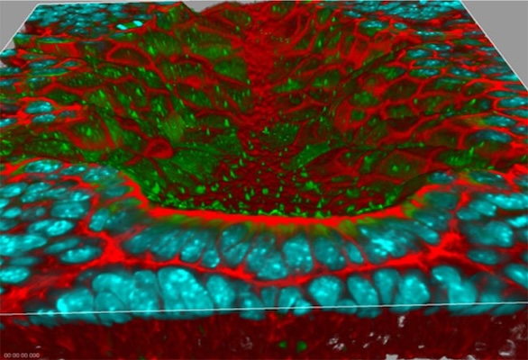 The red staining is F-actin, the green is antibody labeling of acetylated tubulin to visualize cilia, and the cyan is cell nuclei. The sample preparation and labeling were performed in the laboratory of Dr. Terry P. Yamaguchi, Cancer and Developmental Biology Laboratory, Center for Cancer Research, National Cancer Institute. Image acquisition and 3-D rendering were performed in the laboratory of Dr. Stephen Lockett, Advanced Technology Program FNLCR/SAIC-Frederick.