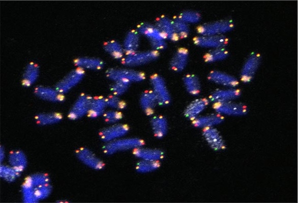 DNA (blue), Centromere (orange), Chromosome 11 (white), G repeat Telomeres (green), C repeat Telomere (red). Metaphase spread was prepared so that one sister chromatid is single stranded. Sample prepared and imaged by Dr. Stephen Sauer, laboratory of Dr. Amar Klar, CCR, NCI-Frederick.