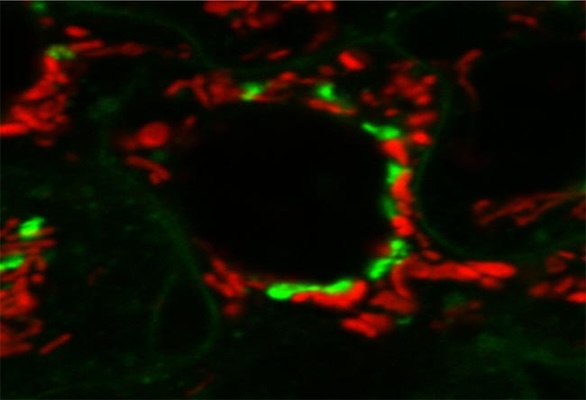 The golgi apparatus (stained green) modifies, sorts and packages proteins for cell secretion or use inside the cell. It also plays roles in lipid transport, lysosome creation and proteoglycan synthesis. Mitochondria (stained red) converts energy into forms that are usable by the cell. It plays roles in cellular respiration as well as cell division, growth and death. Samples prepared and imaged by Dr. Luana Scheffer, laboratory o f Dr. Jairaj Acharya, CCR, FNLCR.