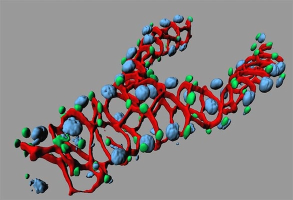 Red channel is antibody-labeled Scrib in RC cells (one of the tumor suppressors in Drosophila) antibody-labeled in Drosophila kidney RC cells; Green is Stat-GFP, which labels the kidney stem cells (RNSC) and transit cells (RB); Blue is DAPI. Sample prepared and images by Dr. Xiankun Zeng, laboratory of Dr. Steven Hou, CCR, FNL and rendered with IMARIS.