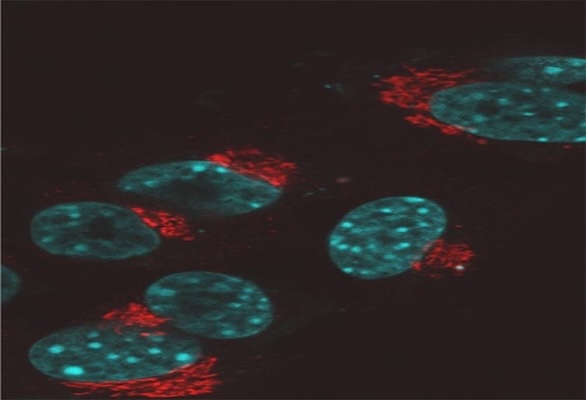 The golgi complex (stained red) and the nucleus (stained cyan). The golgi complex modifies, sorts, and packages proteins for cell secretion or use inside the cell. It also plays roles in lipid transport, lysosome creation and proteoglycan synthesis. Samples prepared and imaged by Dr. Luana Scheffer, laboratory o f Dr. Jairaj Acharya, CCR, FNLCR.